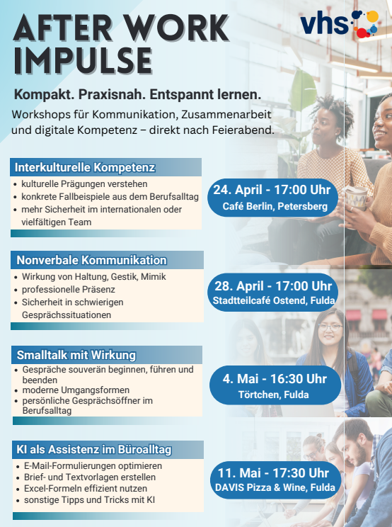Feierabend mal anders: Unsere neue After-Work-Reihe verbindet berufliche Weiterbildung mit inspirierenden Begegnungsorten im Landkreis Fulda. In lockerer Bar- und Restaurantatmosphäre…